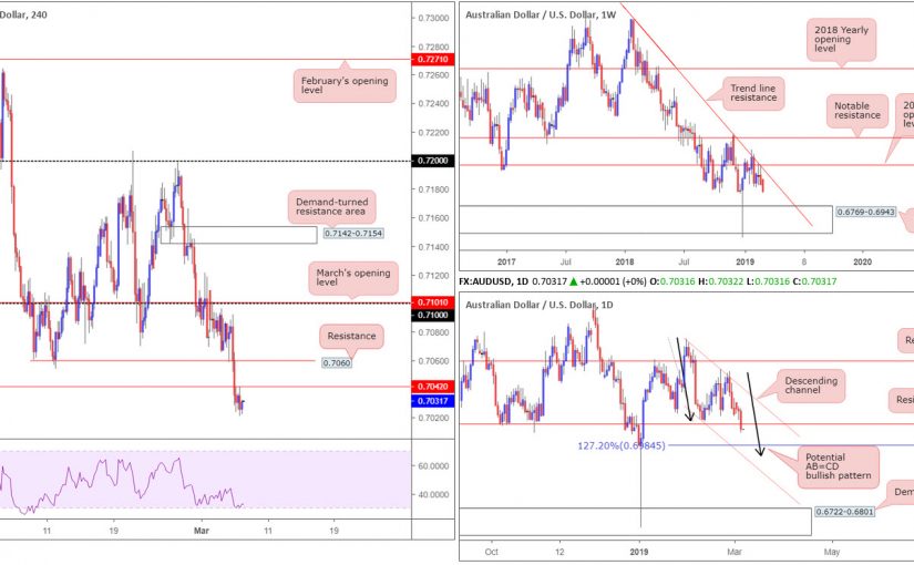 The Australian economy grew by 0.2% in seasonally adjusted chain volume terms in the December quarter, missing a consensus reading of 0.5%. The after-effects witnessed the commodity-linked currency cede ground against its US counterpart Wednesday, consuming H4 support at 0.7060