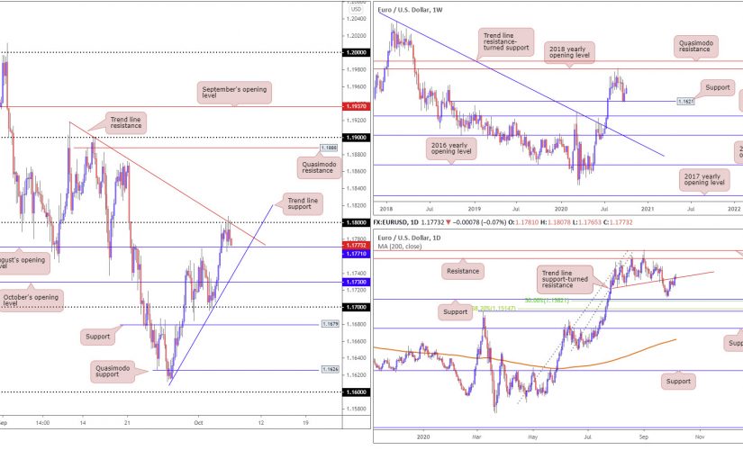 The US dollar rebounded sharply Tuesday, guiding EUR/USD into a bearish environment. Technical price action on the H4 lost grip north of 1.18, and subsequently overthrew August’s opening value at 1.1771 and a trend line support, extended from the low 1.1684.