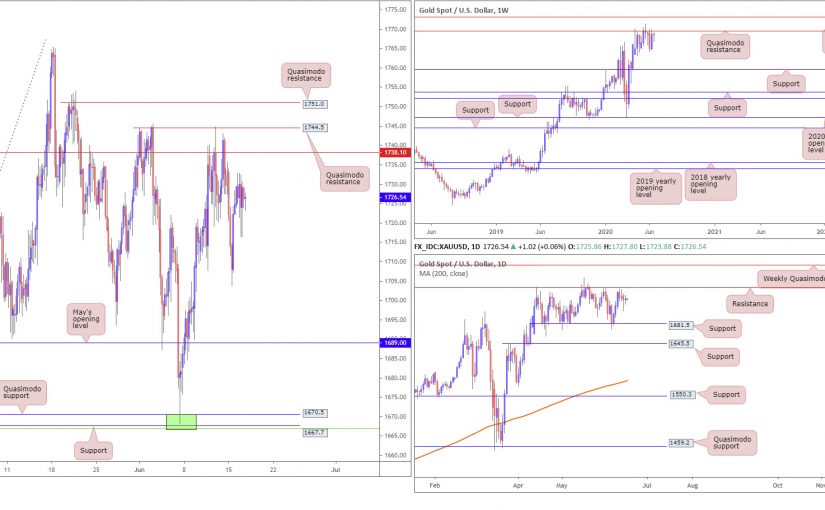 Fuelled by additional USD shorts, EUR/USD climbed to highs at 1.1389 Wednesday, levels not seen since early March. Leaving 1.14 unchallenged, buyers hit the ropes as the pair dived to lows at 1.1342. 1.13 remains a standout support on the H4 timeframe, sharing space with Quasimodo support at 1.1268 and trend line support, extended from the low 1.0727.