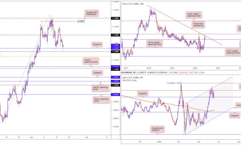 A favourable euro wind elevated EUR/USD over the past three weeks, recently delivering a blow to the 2020 yearly opening level at 1.1222. However, impetus lacked in recent trade after shaking hands with long-standing trend line resistance, extended from the high 1.2555.