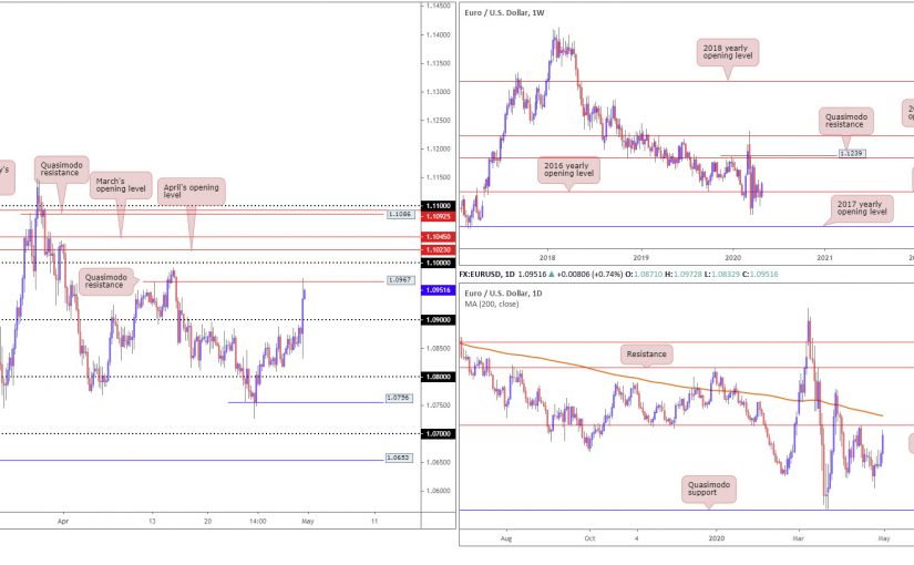 The pair marched higher in early European hours, though failed to sustain gains north of 1.0860 heading into US trade, resulting in price retreating to a H4 channel resistance-turned support, taken from the high 1.0990, sited just ahead of 1.08.