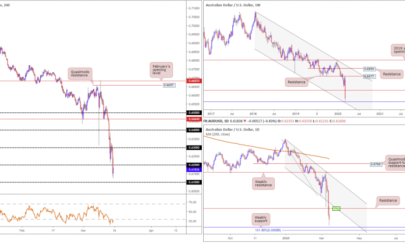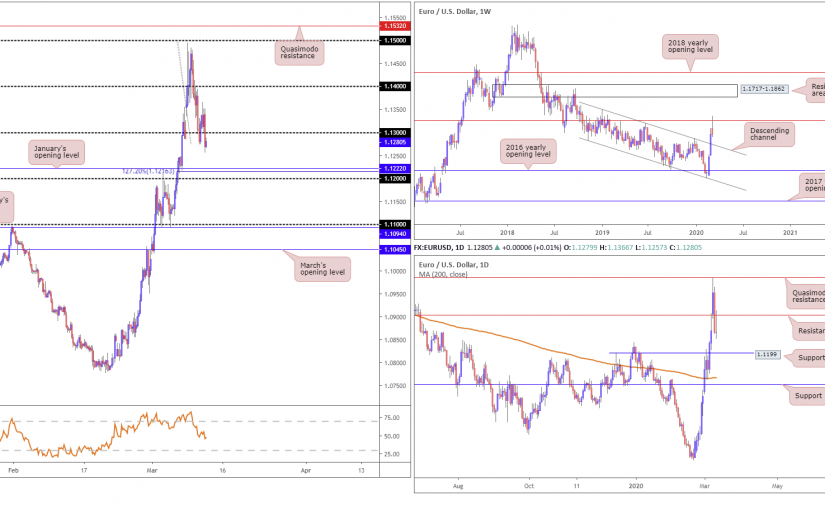 Europe’s shared currency coasted lower Wednesday, fading session peaks at 1.1366. As markets ready themselves for the European Central Bank, H4 price is seen languishing marginally south of 1.13, testing lows of 1.1257. US inflation data (CPI) announced modestly optimistic figures in February, though was largely ignored by market price.