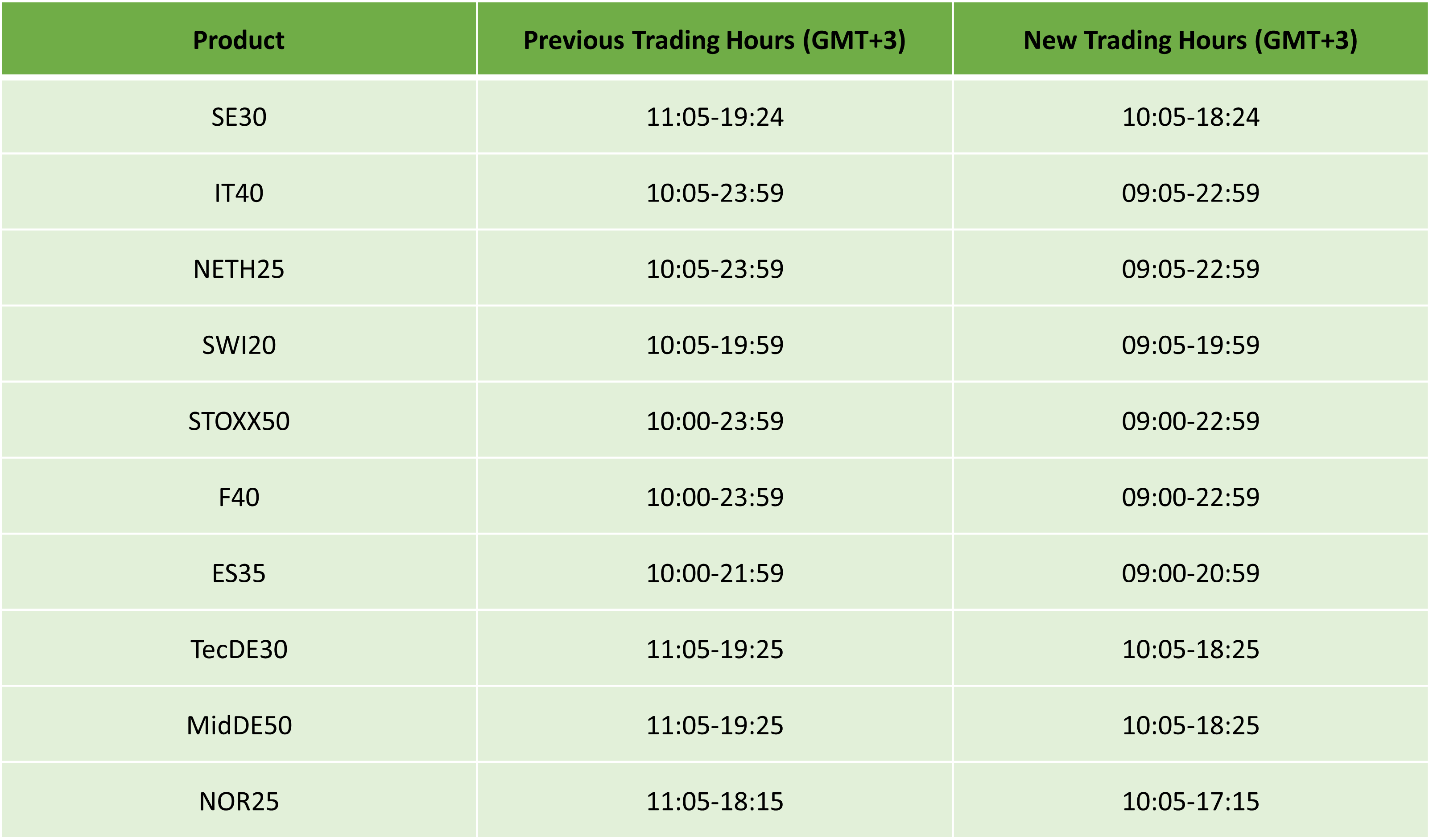 As part of our commitment to providing the best trading experience to our clients, we want to inform you there will be an adjustment in the trading schedule due to the Europe entering Daylight Savings on Sunday, 29 March 2026.
